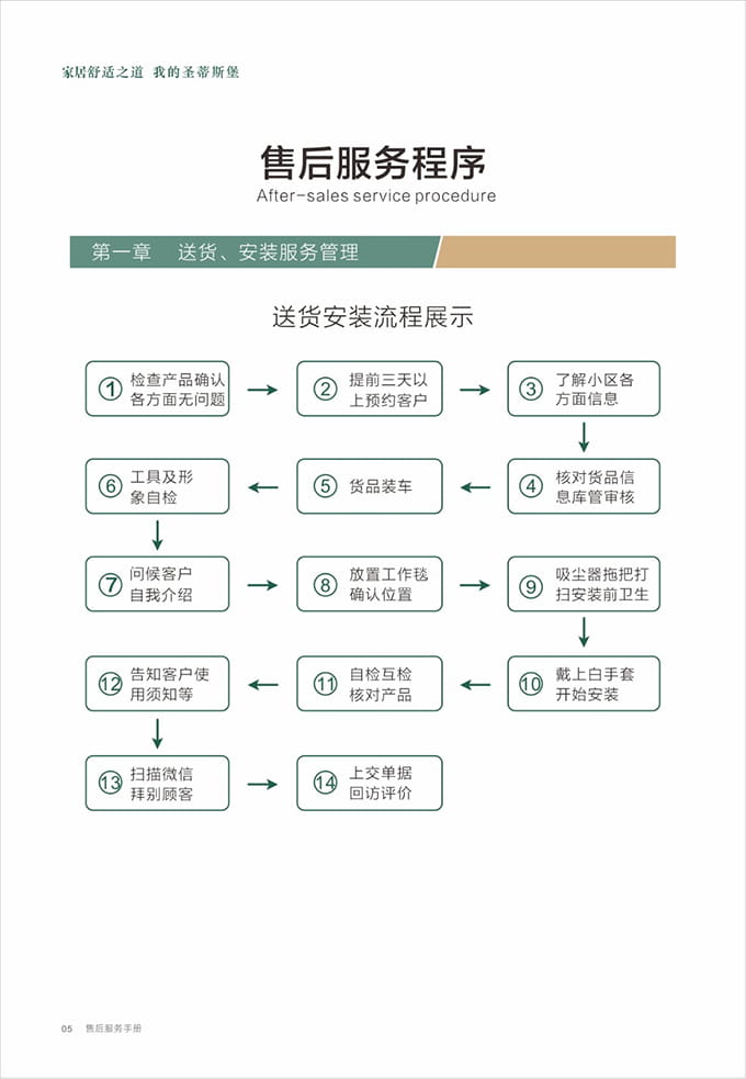 1、根据约定时间至少提前5分钟上门,送货安装服务人员到达客户所在小区或单元时需立即电话或微信通知客户;