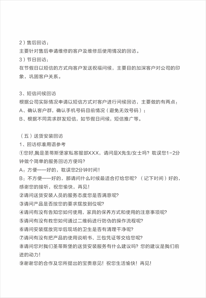 话术参考:“**先生/女士您好,我是xingkong的售后服务人员**,您购买的xingkong家具已经全部到货了,送货安装大约需要**时间,请问您这边什么时候方便我们上门送货安装呢?”同时要了解送货小区的电梯、楼道、入户门的尺寸等,提前做好准备,避免意外情况。最后确定送货时间(安装所需要时长),并告知客户安装人员的相关信息,可加微信发送,并发送配送安装流程说明。
