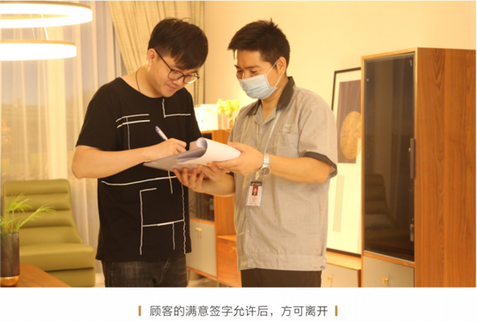 安装并检查完所有工作后,需与客户清点并确认产品,将所有带电源的家具插上电源,告知客户家具使用方法和功能及保养知识、注意事项等。所有带功能的产品需演示给客户看。例: